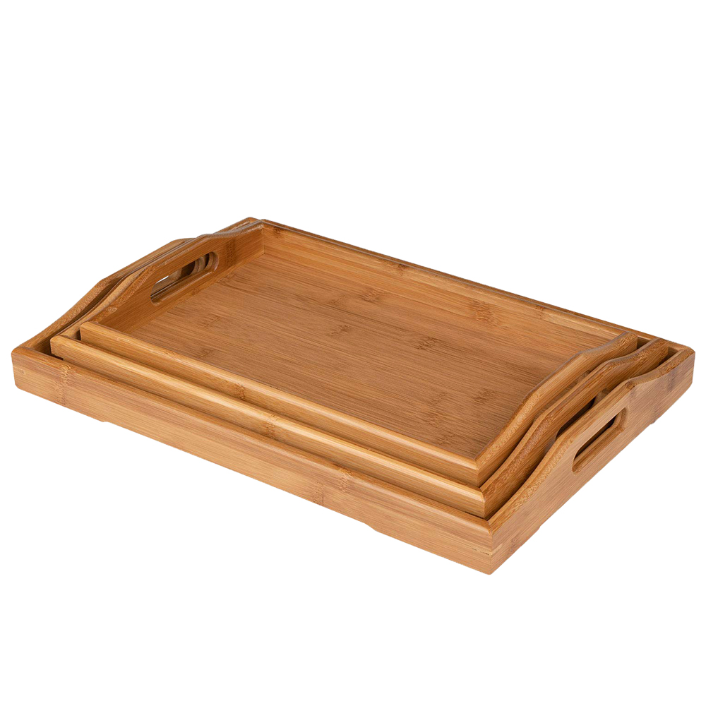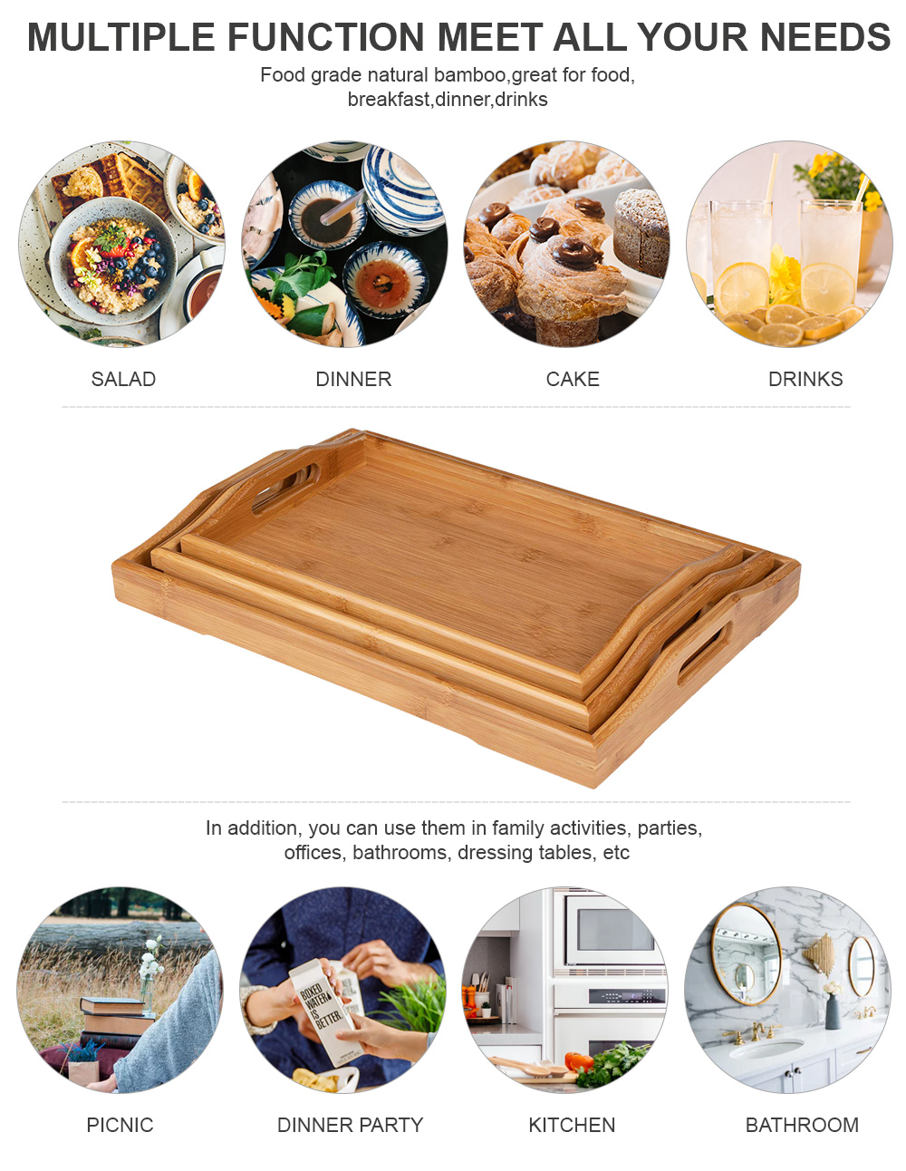 MULTIPLE FUNCTION MEET ALL YOUR NEEDS: Food grade natural bamboo,great for food,breakfast,dinner,drinks,cake or any food serving trays. In addition, you can use them in family activities, parties, offices, bathrooms, dressing tables, etc