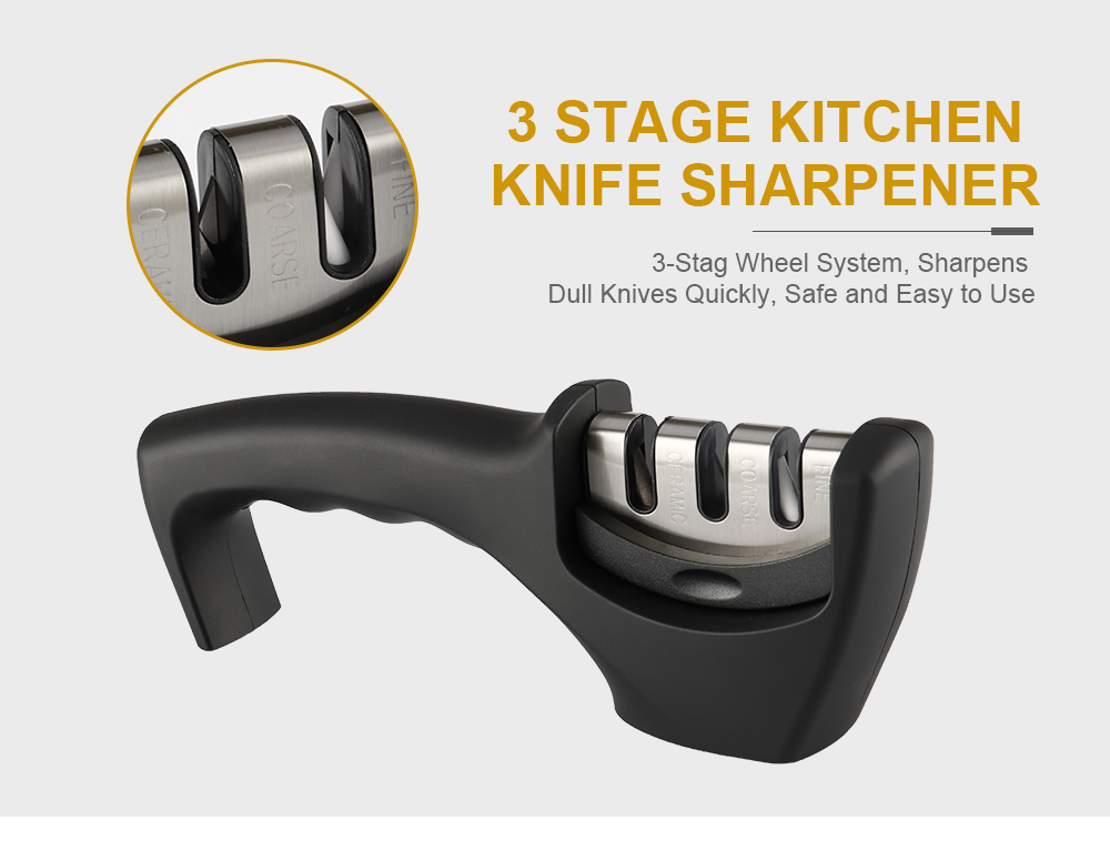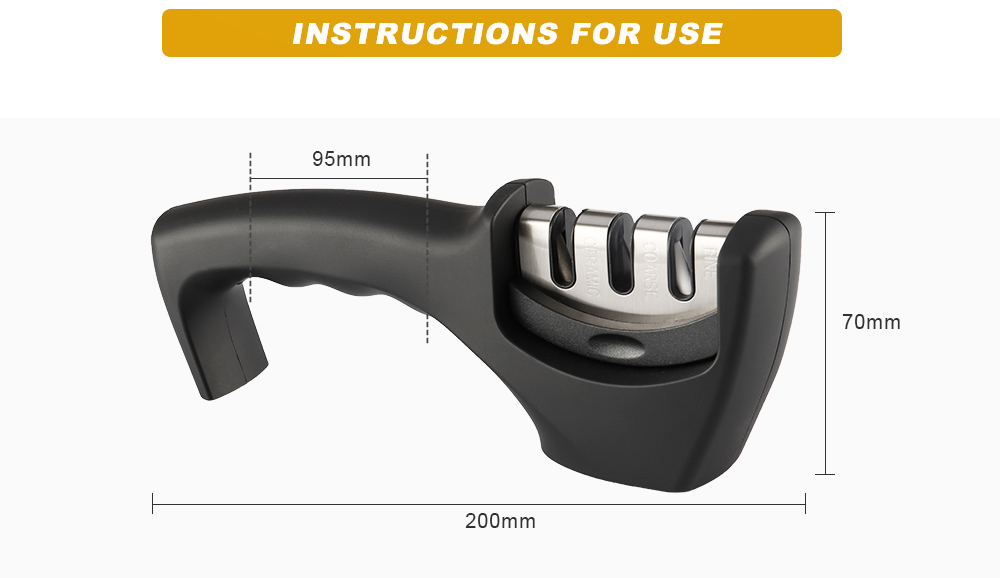 EASY TO USE: 4 - stage sharpener is designed with a foucus point for your thumb. increasing the stability of the kitchen tools, no rust, and no more grinding your knives on handheld stones. Would be safer for your hand while sharpening. The Knife Sharpener is perfect for daily use, meticulously tested also Perfect to all sharpen kinds of blades like Chef's, Utility, Paring, Clip Point, Tourné, Slicers, Boning, Filleting and Cleaver knives.